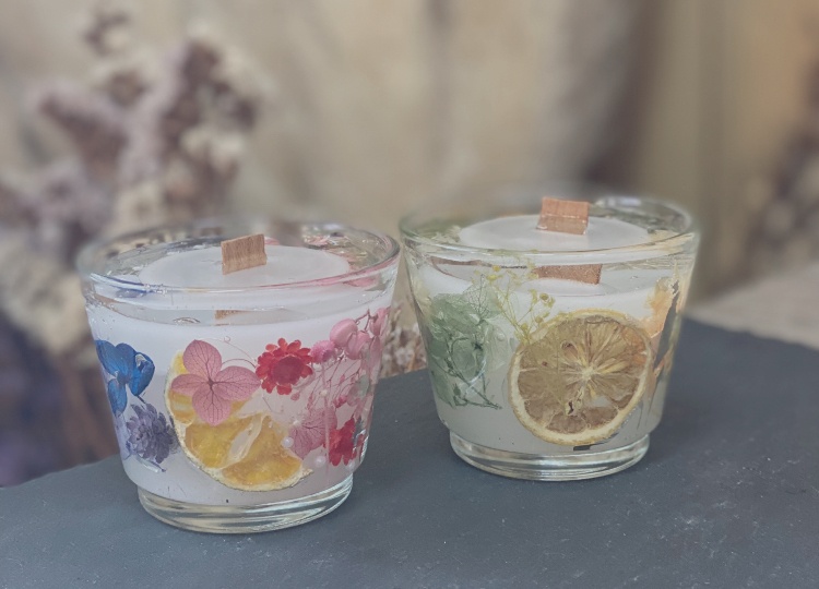 (所要時間約30分)お好きなお花と柑橘ドライフルーツを選んで作れるキャンドル。クリアのジェルキャンドルを使用しているので、お花がしっかり透けて見えます。注目のウッドウィックを使用しているので火を灯せば「パチパチッ」と焚き火や暖炉のような音で癒されます。・クリアジェルキャンドル ¥2500
